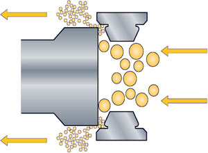 原產型均質機首要任務是經由過程柱塞來去活動將被加工物料以高壓的情勢送至均質閥,使物料流經閥頭與閥座間細小的隙瞬遭到湍流、空穴、撞擊、剪切等復合的感化,將本來粗拙的乳濁液或懸浮液加工成極纖細的、平均不變的液與液相混乳化物或液與固分離物。